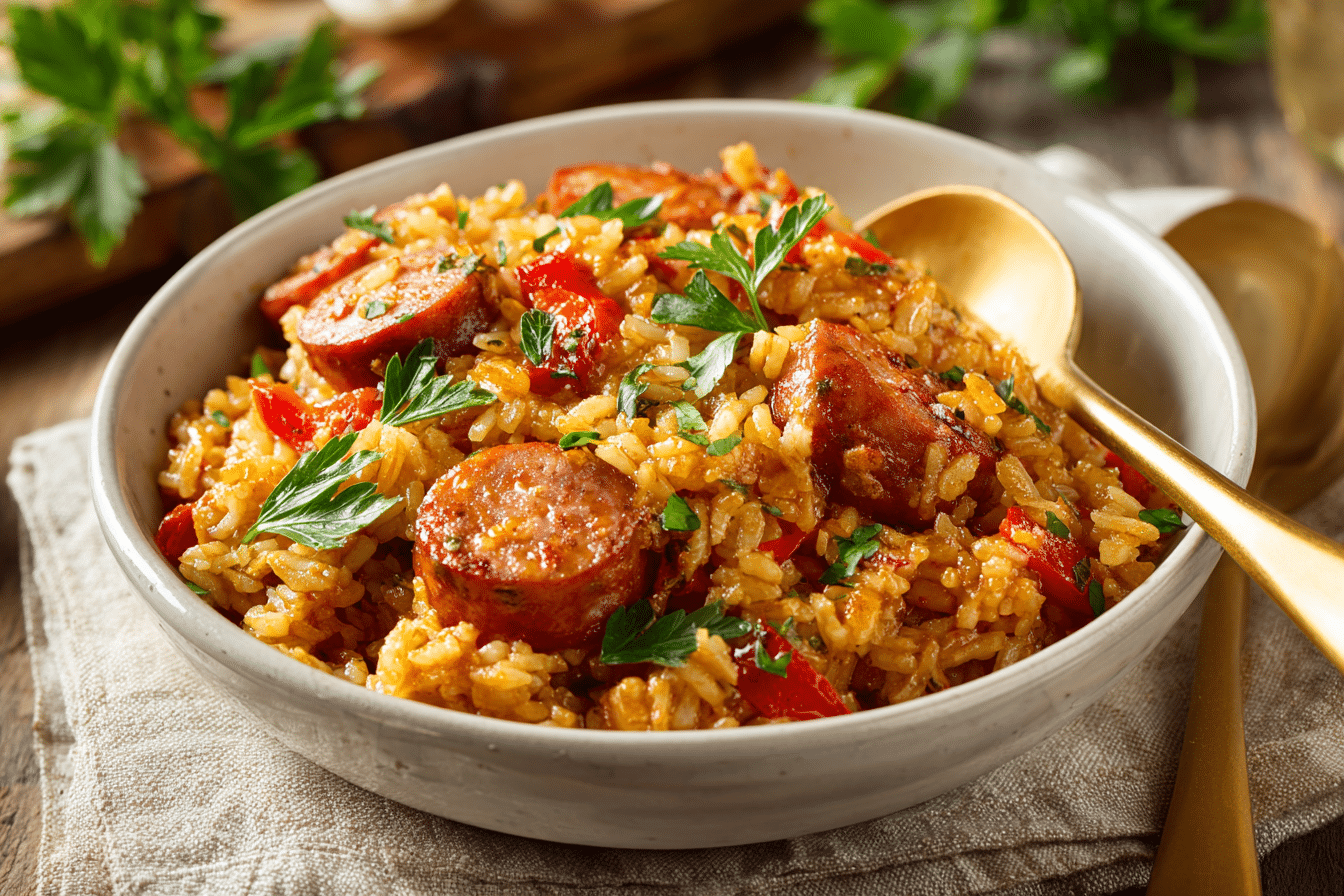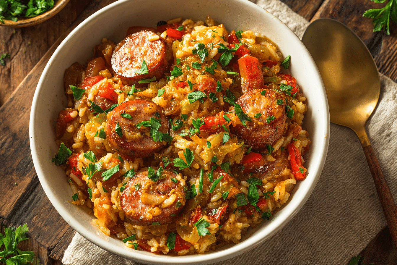 In this version, smoky sausage adds a hearty, spicy punch to the traditional base of sautéed onions, bell peppers, celery, garlic, and Cajun spices. It’s easy to make, perfect for meal prep, and versatile enough to serve as a main or a bold side dish.