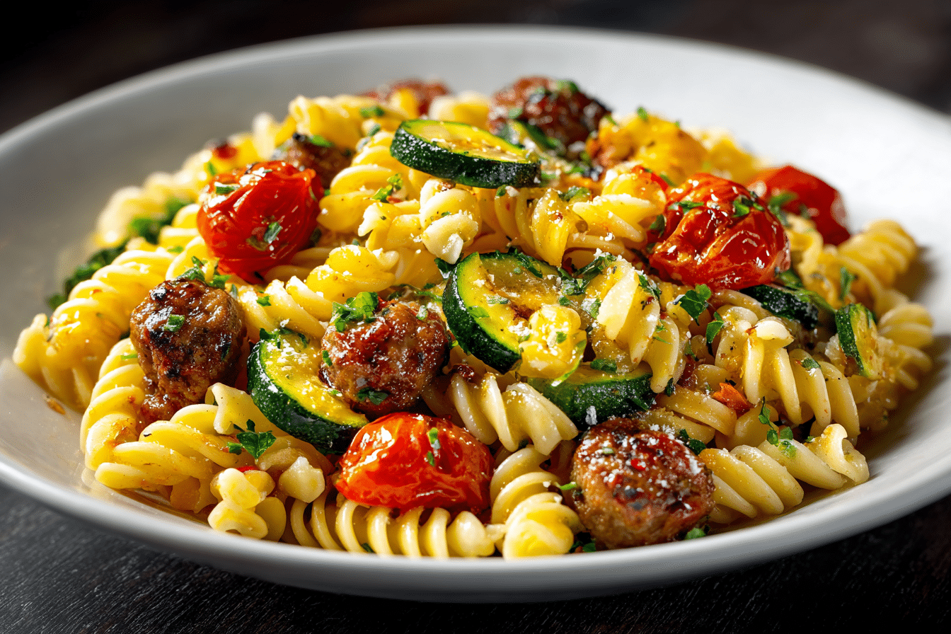 This Chicken Sausages with Zucchini, Tomatoes, and Pasta recipe is a colorful, wholesome dinner that comes together in one skillet and under 30 minutes. Juicy chicken sausages are sautéed with tender zucchini and burst cherry tomatoes, then tossed with your favorite pasta for a simple yet satisfying meal that’s perfect for weeknights.