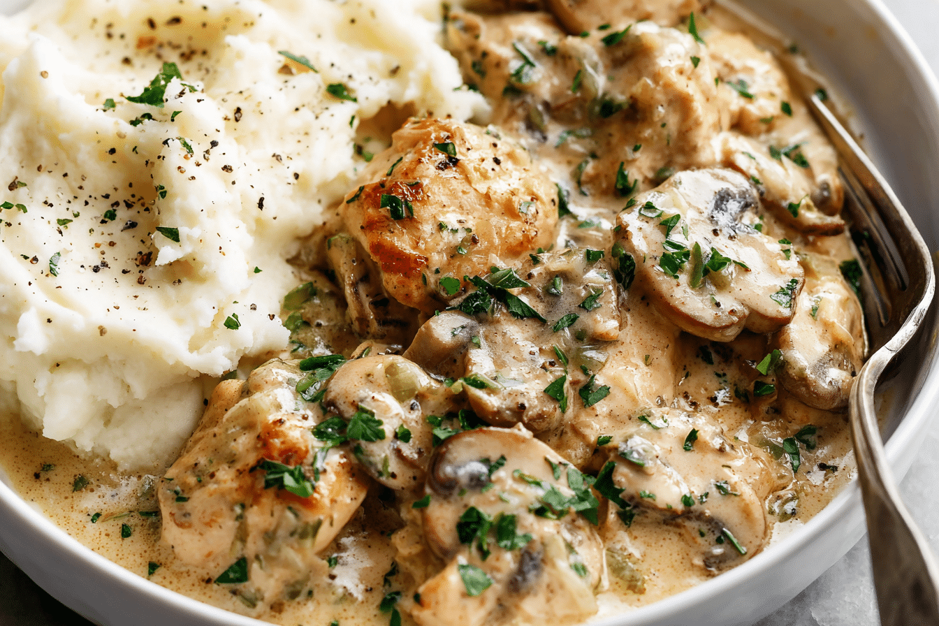 Served over pasta, rice, or mashed potatoes, creamy chicken stroganoff feels luxurious yet is surprisingly easy to make in under 40 minutes.