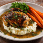 The Garlic Herb Chicken & Carrot Plate is the kind of dinner that feels like a deep breath after a long day—easy to prepare, beautifully balanced, and full of earthy, comforting flavor. With golden-seared chicken infused with fresh garlic and herbs, plus tender roasted carrots caramelized to natural sweetness, this plate serves rustic simplicity in the most satisfying way.