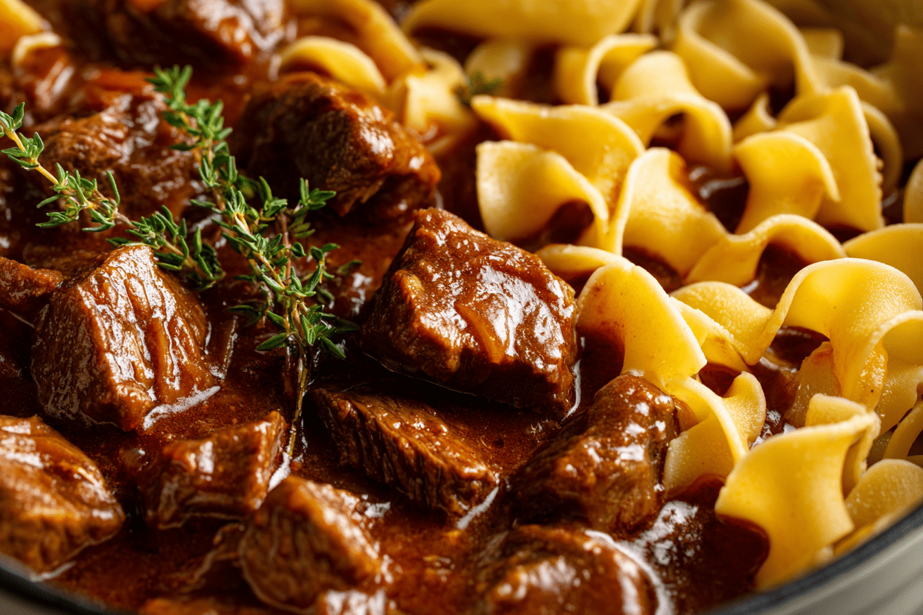 Egg Noodles – Wide egg noodles are the classic choice. They soak up the flavorful liquid and provide a soft, chewy contrast to the tender beef. Substitute with rotini or pappardelle if desired, but avoid delicate pastas that may fall apart.