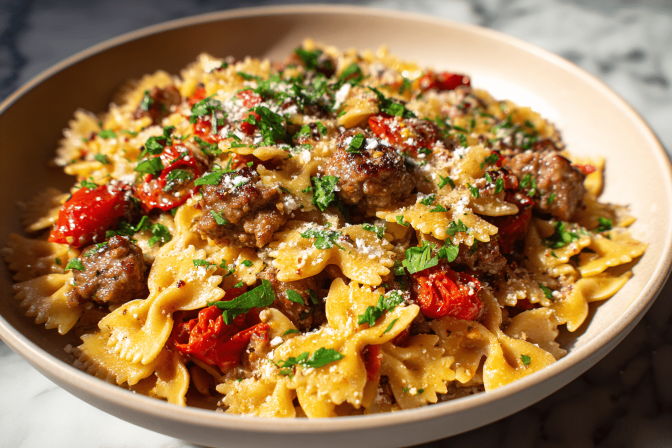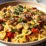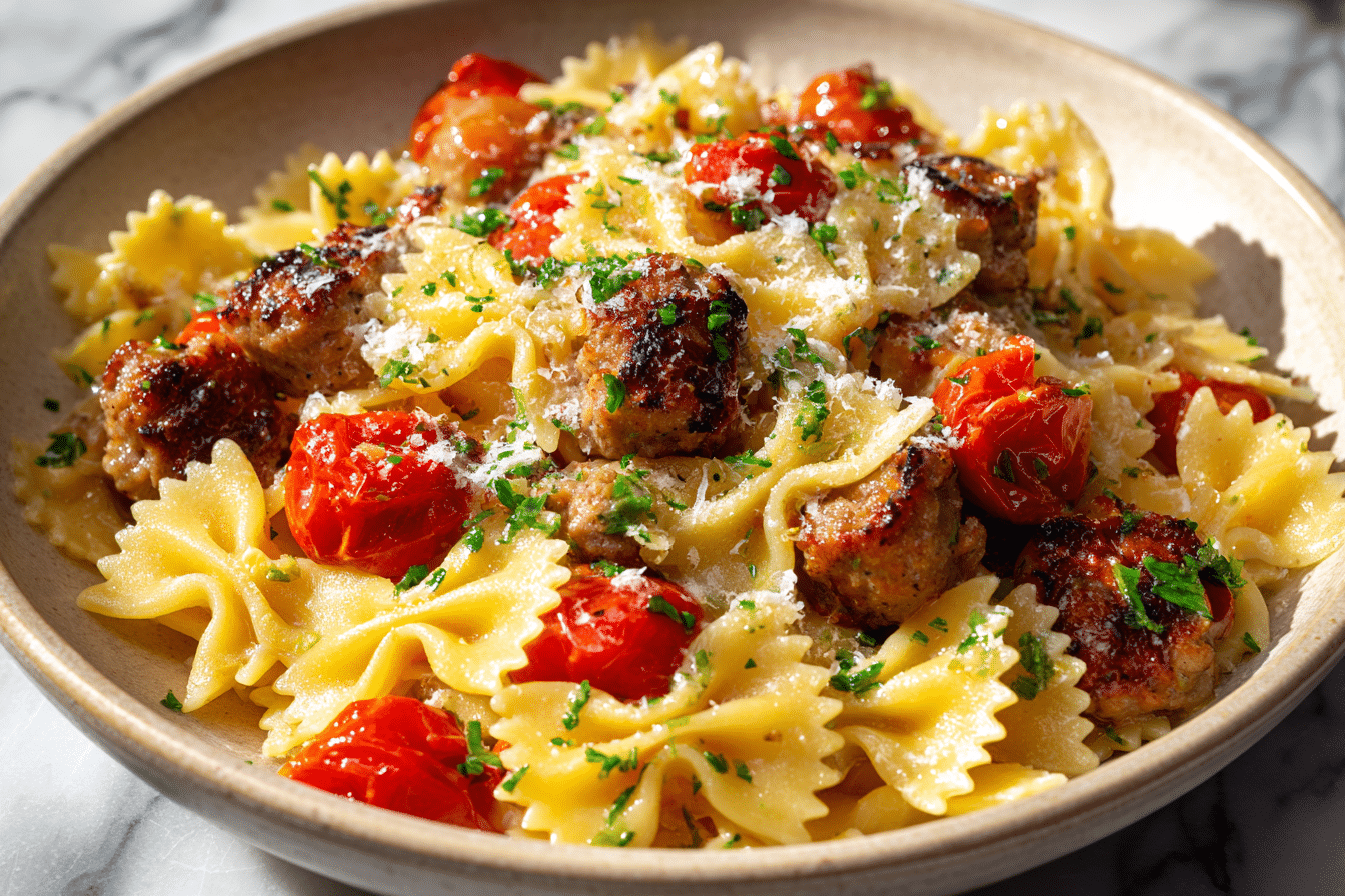 A comforting pasta dish featuring bow tie pasta, savory Italian sausage, and a rich tomato cream sauce. Quick, easy, and perfect for weeknight dinners.