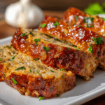A juicy, savory meatloaf loaded with garlic, herbs, and Parmesan cheese, finished with a buttery garlic topping. Comforting, flavorful, and ready in an hour.