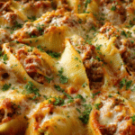 Sausage Stuffed Shells are the kind of comforting baked pasta dish that brings warmth and satisfaction to the table. Large pasta shells are filled generously with a savory mixture of seasoned sausage and creamy cheese, then baked in rich tomato sauce until bubbly and golden. Each bite delivers tender pasta, hearty filling, and melted cheese layered together beautifully.